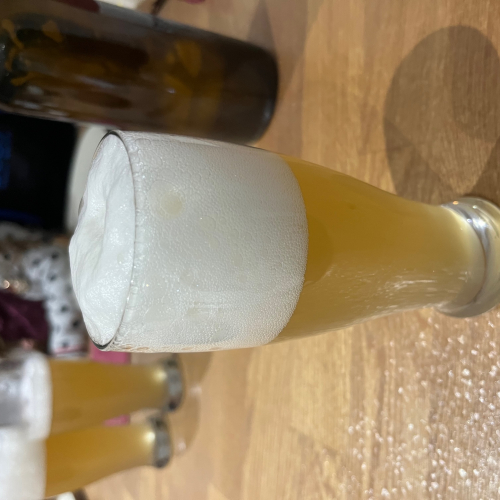 Bière très gazeuse avec un beau col de mousse.