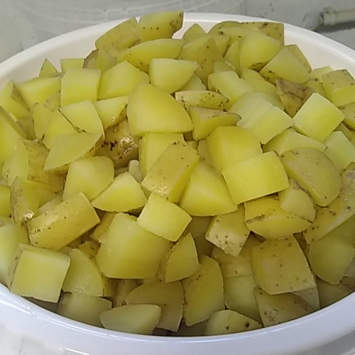 | Utiliser des pommes de terre pour salade parce qu'elles se tiennent à la cuisson, contrairement aux patates à purée qui se délitent complètement. Celles-ci obstrueraient les trous du filtre/panier et se déposeraient au fond de la cuve de brassage pour brûler. Avant d'empâter il faut au préalable cuire les pommes de terre. Ce n'est pas la peine de les éplucher. Bien les laver puis les couper en cubes de 1.5 cm. Ensuite les cuire normalement sans saler l'eau. Elles seront ajoutées au malt concassé. Il faut également récupérer l'eau de cuisson et s'en servir comme eau d'empâtage. Il faut aussi penser à réduire un peu le volume de rinçage, parce que les pommes de terre sont déjà gorgées d'eau et par conséquent n'absorberont pas d'eau d'empâtage. | |||||||