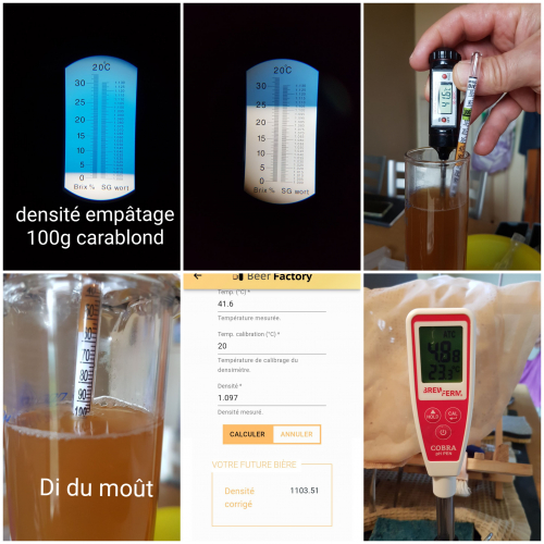 j'ai d'abord empâté les 100 g de carablond à 63°c directement dans 4l d'eau. Après vérification au test à l'iode (environ 30', DS 1.006) j'ai ajouté les miels, complété le volume jusqu'à 5 l (prévoir un peu plus à cause de la rétractation au refroidissement (50 à 100 ml), puis porté à 70-71 °c pendant 15' pour pasteuriser. Refroidissement comme pour une bière. On obtient :